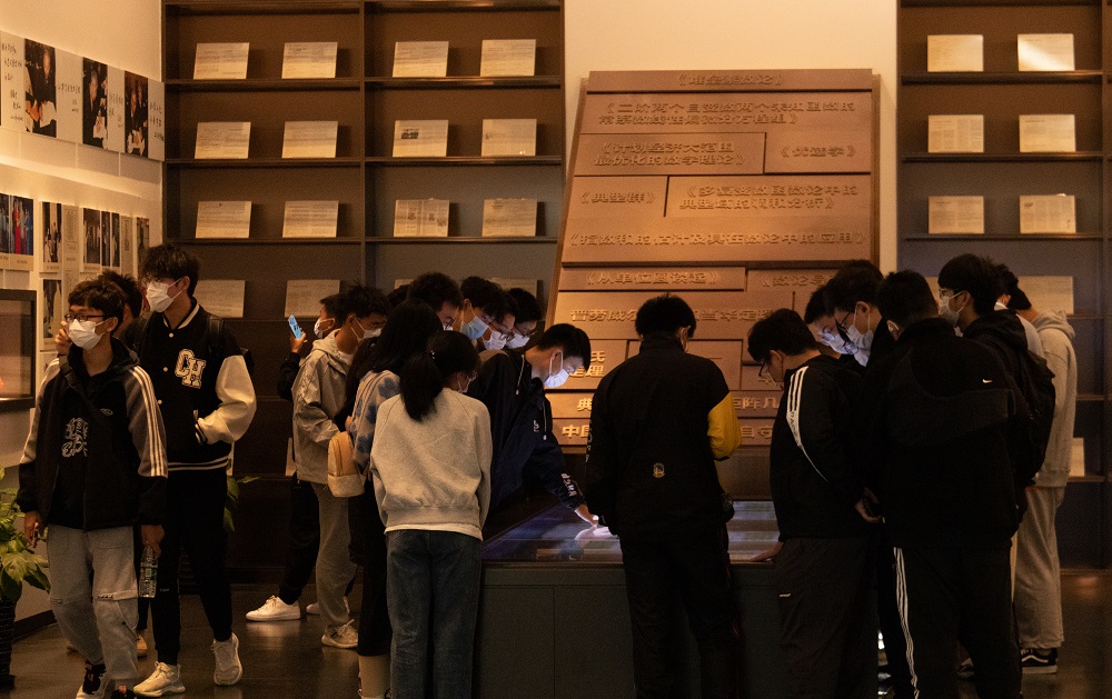 纪念馆以华老铜像为中心,大体呈圆形展开。馆内陈列了大量珍贵的实物原件,辅以图文展板和增强现实技术,展示了关于华老的重要生活、工作情景,还原了华老的人生轨迹。馆中的每一张照片、每一件实物,无不体现了华老一生的奋斗历程和爱国故事。挑灯夜读、自学课程、海外求学、情系家国……跟随讲解员的步伐,同学们沉浸式地回顾了华老的生平,感受到了华老对学术的鞠躬尽瘁、对家乡的殷殷深情、对祖国的忠诚之志,华罗庚先生献身科学事业、为人民服务的精神无不令同学们心生崇敬。