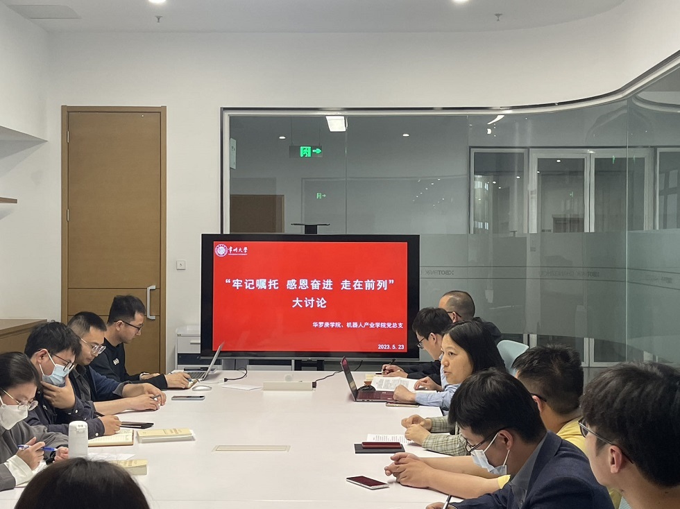 5月22日下午,篮球直播88 、机器人产业篮球直播88 党总支开展“牢记嘱托、感恩奋进、走在前列”大讨论,深入学习贯彻习近平新时代中国特色社会主义思想,总结交流前一阶段学习和调研成果,努力以学铸魂、以学增智、以学正风、以学促干。会议由篮球直播88 党总支书记宣慧主持,全体教师党员和部分学生党员代表参加讨论。
