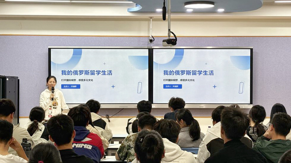 分享会现场,洪逸群以她在俄罗斯的留学生活为背景,通过一系列生动的照片和个人经历,向同学们展示了俄罗斯的自然风光、文化特色以及她在异国他乡的学习与生活体验。她鼓励同学们勇于走出舒适区,趁青春大好年华去探索更广阔的世界。现场气氛轻松活跃,同学们反响热烈,展现出对国际交流的浓厚兴趣。