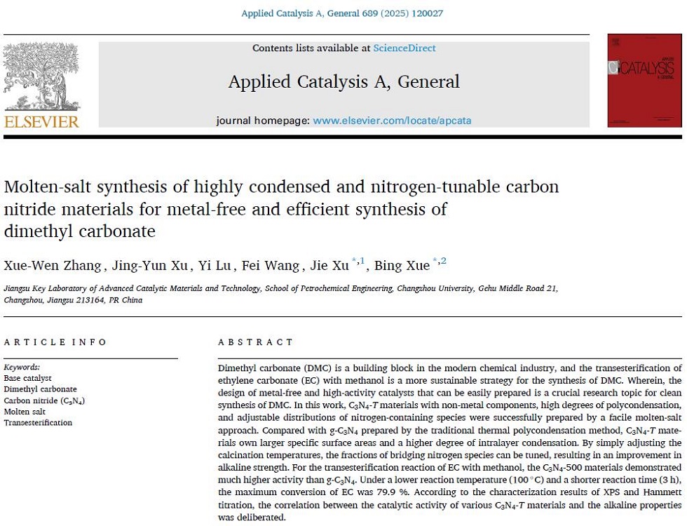 近日,华院231许靖云同学参与的研究论文“Molten-salt synthesis of highly condensed and nitrogen-tunable carbon nitride materials for metal-free and efficient synthesis of dimethyl carbonate”在期刊Applied Catalysis A General(SCI二区) 发表。