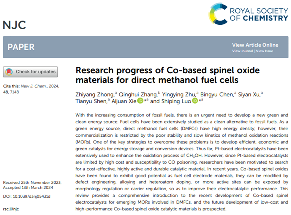 近日,篮球直播88 华院221张庆辉同学参与的学术论文Research progress of Co-based spinel oxide materials for direct methanol fuel cells 在期刊《New Journal of Chemistry》(SCI三区)发表。