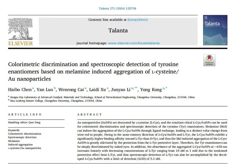 近日,华院221罗燕同学作为课题主要参与者,其研究论文“Colorimetric discrimination and spectroscopic detection of tyrosine enantiomers based on melamine induced aggregation of L-cysteine/Au nanoparticles”在期刊《Talanta》成功发表。据了解,该期刊被SCI收录,JCR分区为一区,影响因子5.6,罗燕为论文二作。