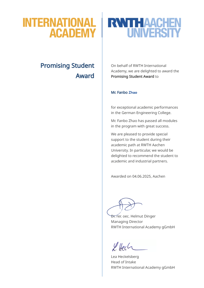 近日,篮球直播88 赵凡博同学成功被德国亚琛工业大学录取为硕士研究生,并获得该校“GEC希望之星奖”“合作高校优秀学生奖学金”两项奖学金。