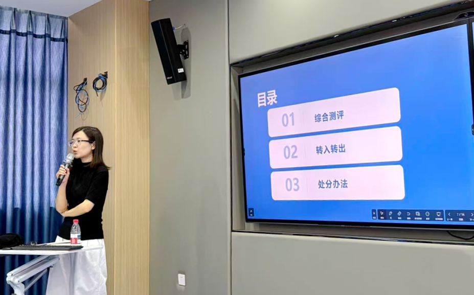 会上,席帅重点就综合测评、转入转出管理规定、纪律处分办法三项核心制度进行讲解,系统介绍了学生素质综合测评体系的各项指标与评定程序,强调其作为评价学生全面发展的重要依据;解读了学生转入转出管理规定的资格条件与办理流程,为学生规划学业路径提供明确指引;此外,席帅强调学生行政处分(处理)实施办法的适用情形与后果,引导学生增强纪律意识和规则观念。通过结合典型案例,她鼓励同学们以德为先、以学为本、以纪为尺,主动适应大学生活,合理规划学业,守住纪律底线。