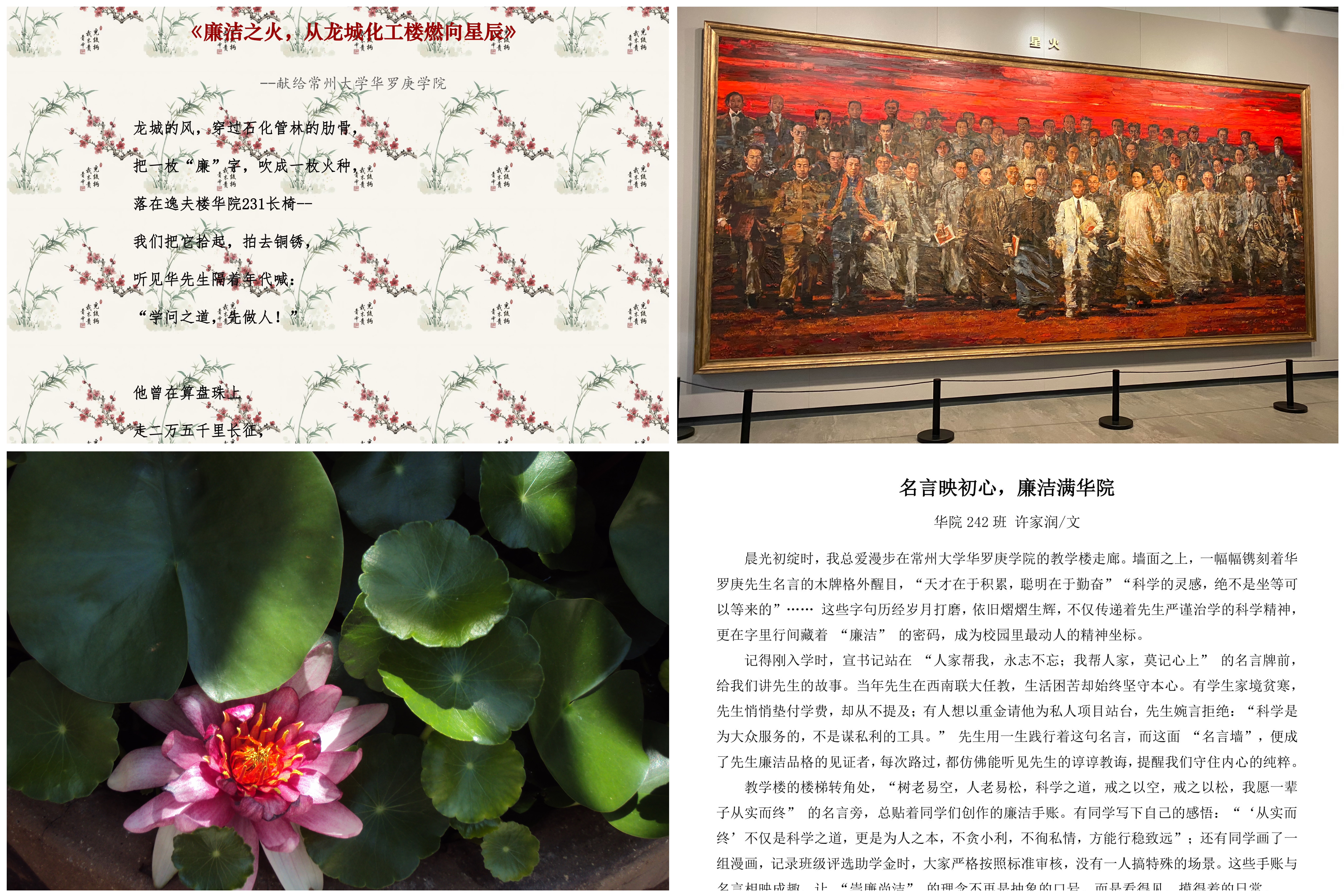 摄影作品通过光影传递廉洁内涵。摄影作品《睡莲》则聚焦睡莲的洁净姿态,以自然之美隐喻廉洁品德;《星火》则将镜头对准上海中共一大纪念馆,定格革命场景,展现先辈“不谋私利、一心为公”的品质,让红色精神与廉洁文化相融合。文学作品同样亮点突出,诗歌《廉洁之火,从龙城化工楼燃向星辰》以化工意象结合青春誓言,勾勒清廉风骨;散文《名言映初心,廉洁满华院》依托校园华罗庚名言墙,讲述廉洁文化在校园的传承故事。