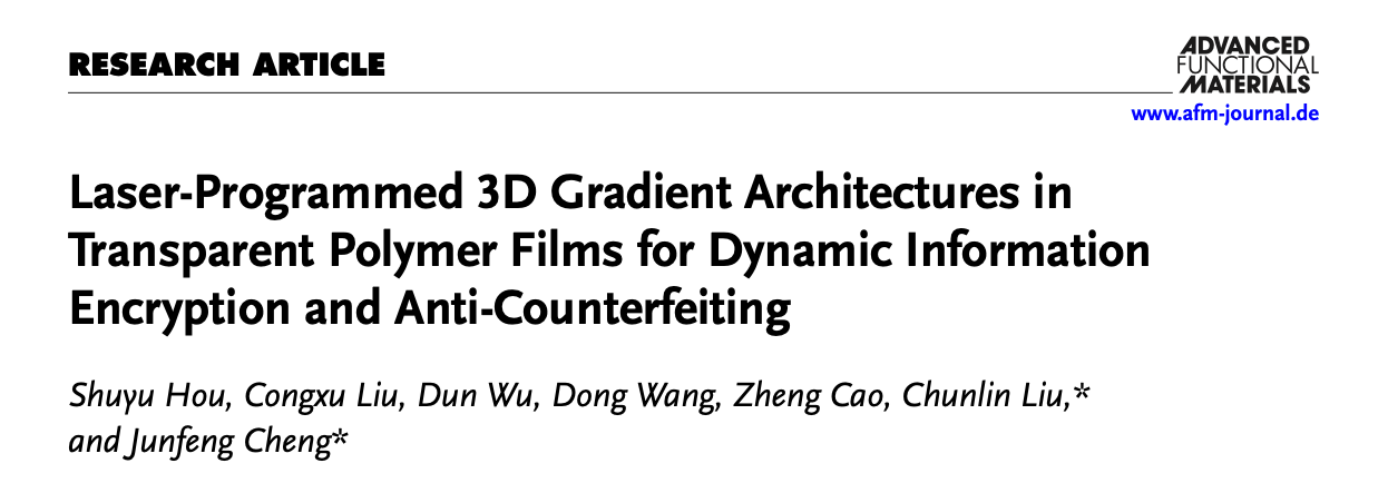 近日,华院231班刘从旭同学作为第二作者,其研究成果论文“Laser‐Programmed 3D Gradient Architectures in Transparent Polymer Films for Dynamic Information Encryption and Anti‐Counterfeiting”发表在国际顶级期刊《Advanced Functional Materials》(SCI一区,影响因子19)上。该论文由常州大学材料科学与工程篮球直播88 成骏峰教授指导完成。