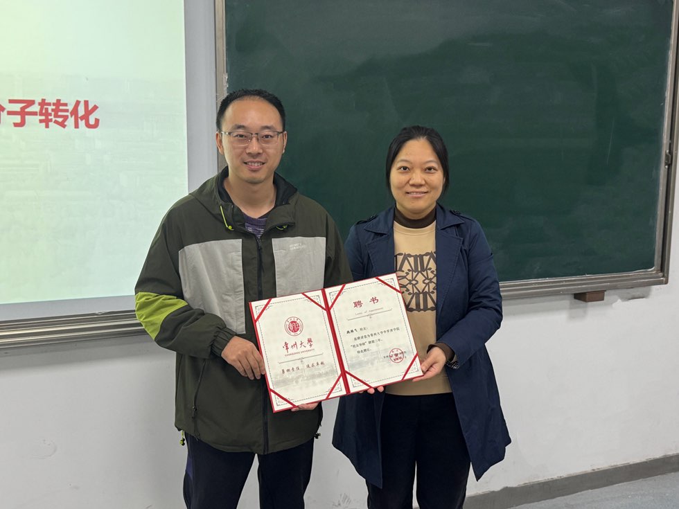 讲座开始前,篮球直播88 党总支书记宣慧为魏鹏飞颁发“校友导师”聘书。