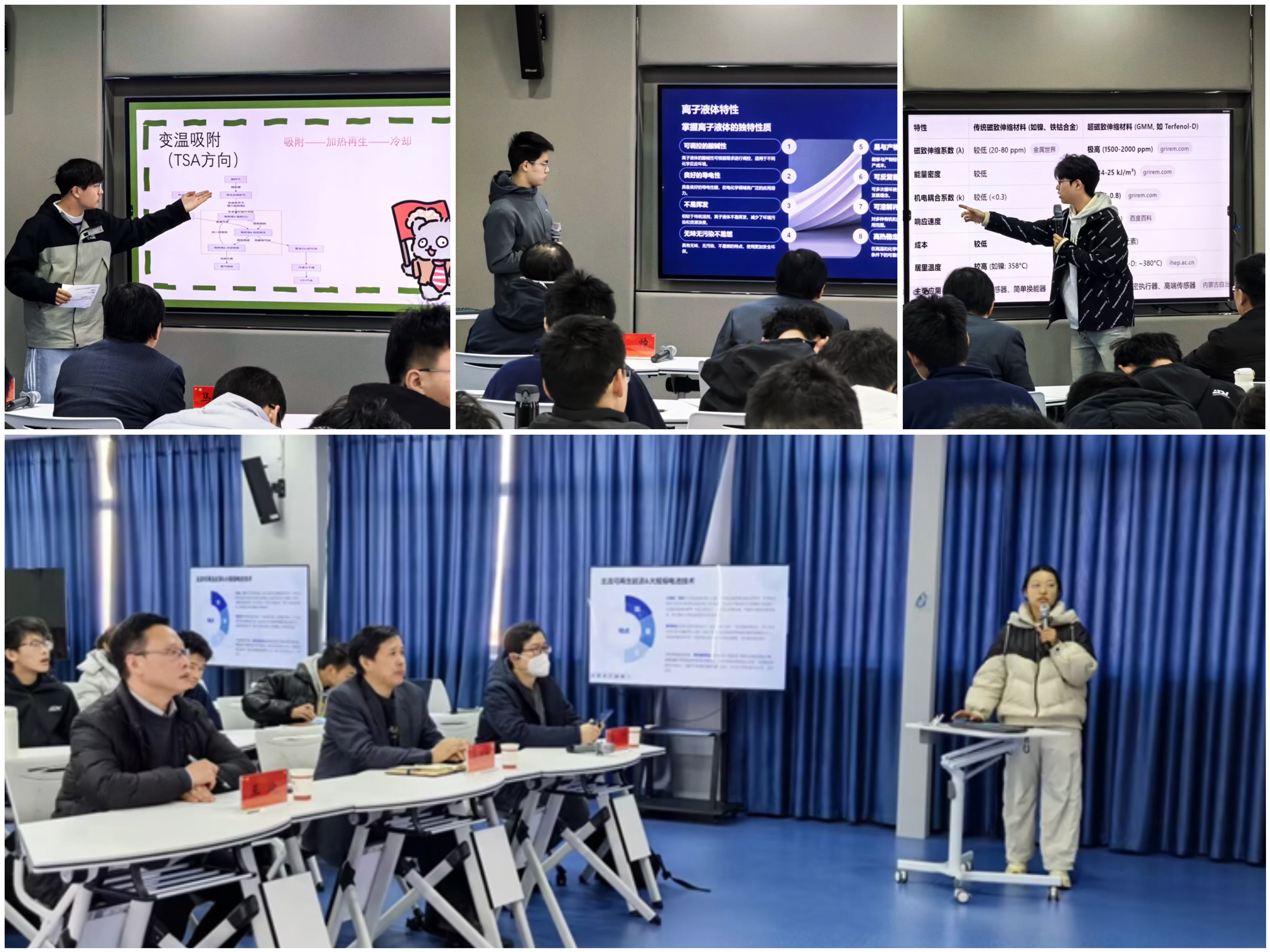各组成员围绕化工、新能源材料等领域中感兴趣的前沿研究问题,通过PPT形式展示了他们结合课程内容开展的学习研究成果。评委老师对每组同学的汇报内容进行点评,对同学们结合专业方向、积极钻研领域内知识的探索行为给予了充分认可,并对文献来源权威性、数据引用严谨性和汇报内容的逻辑结构提出改进建议。